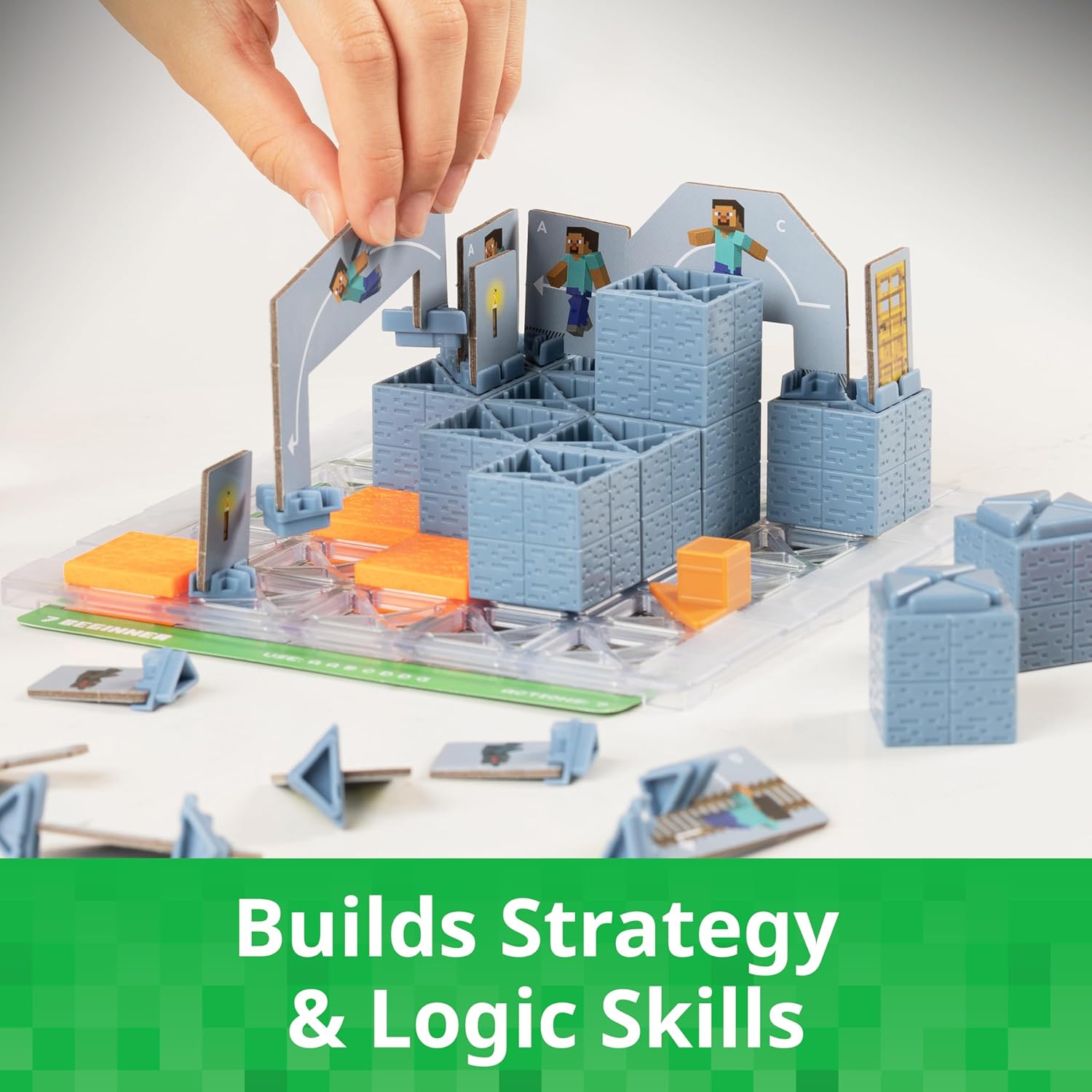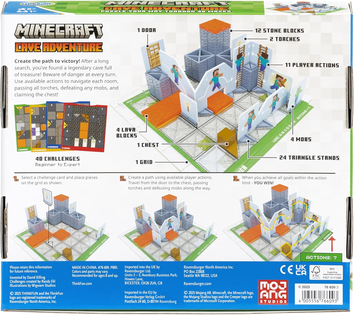 Minecraft Cave Adventure turns Minecraft into a hands-on strategy game with 40 solo puzzles. Every move counts in this epic offline quest! Your next Minecraft mission starts now! Discover a legendary cave full of treasure but beware of danger! Use available actions to navigate each room, passing all torches, defeating any mobs, and claiming the chest in ThinkFun Minecraft Cave Adventure.