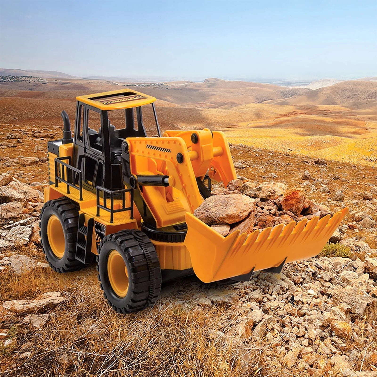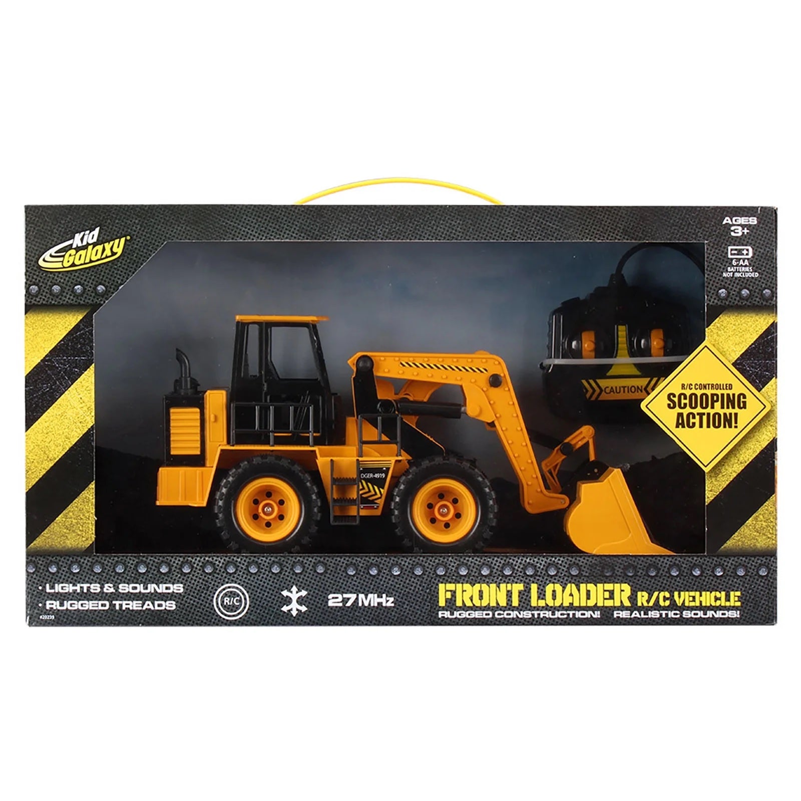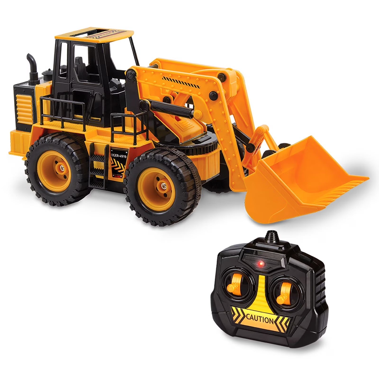 This radio-controlled front loader allows kids to scoop up and load small toys, sand, or loose dirt for imaginative construction play. Features easy-to-control skid steering, where pushing both levers forward moves it forward, both back for reverse, and one forward to turn. Designed with realistic scale and details, providing a true-to-life construction vehicle appearance. The remote control enables the excavator to move in all directions, including up and down for the digging arm.