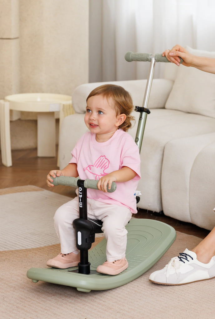Stage 3: By moving the seat/T-bar combo to the Mini scooter base, kids can take their first ride on wheels—rolling forward while a parent provides support with the push bar.