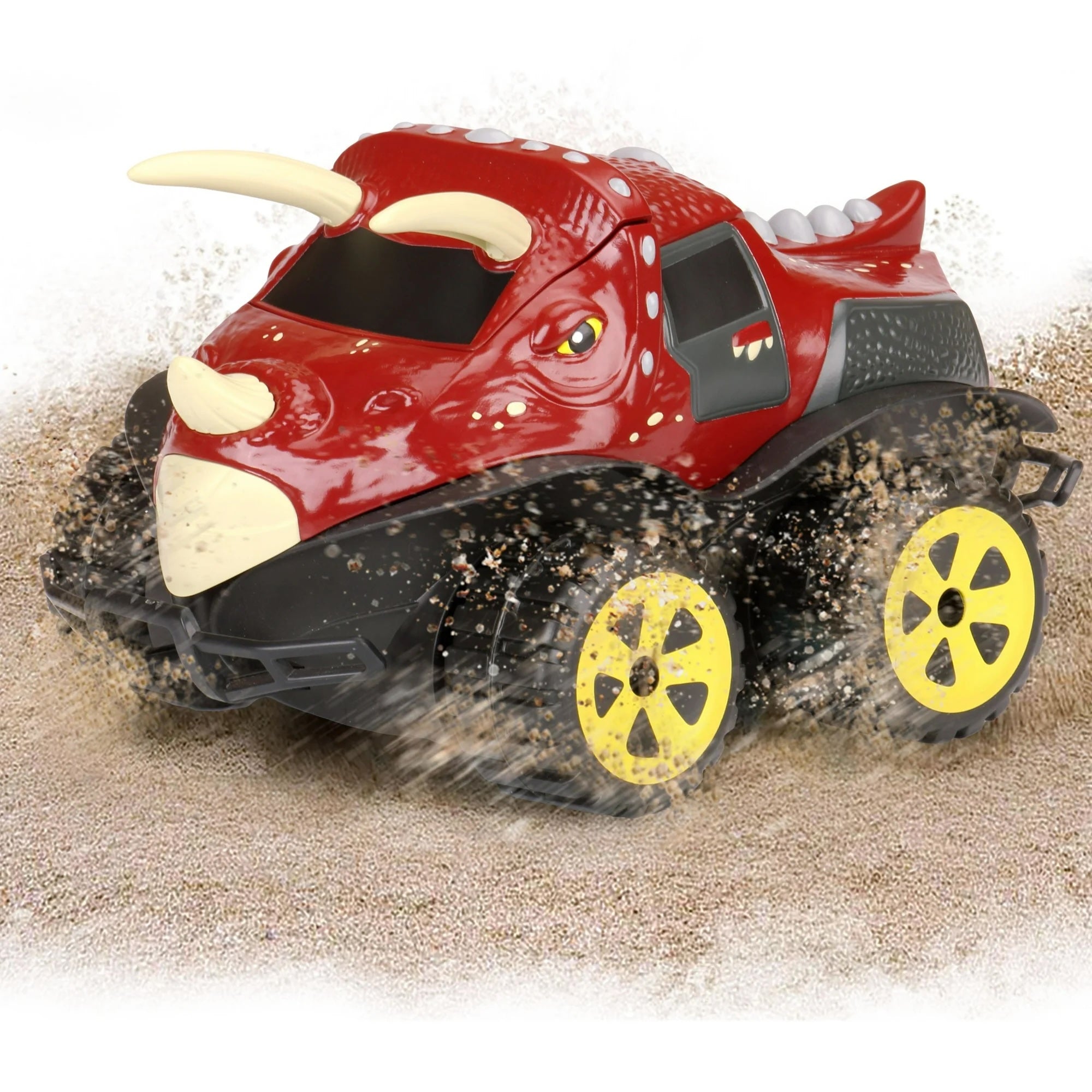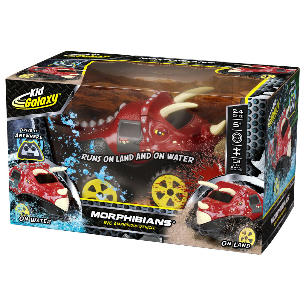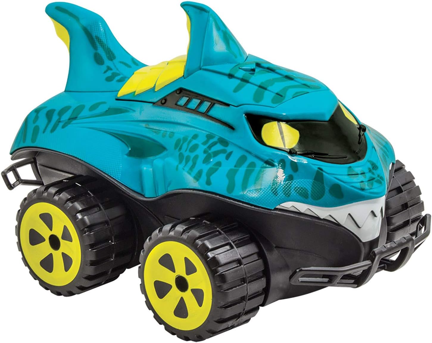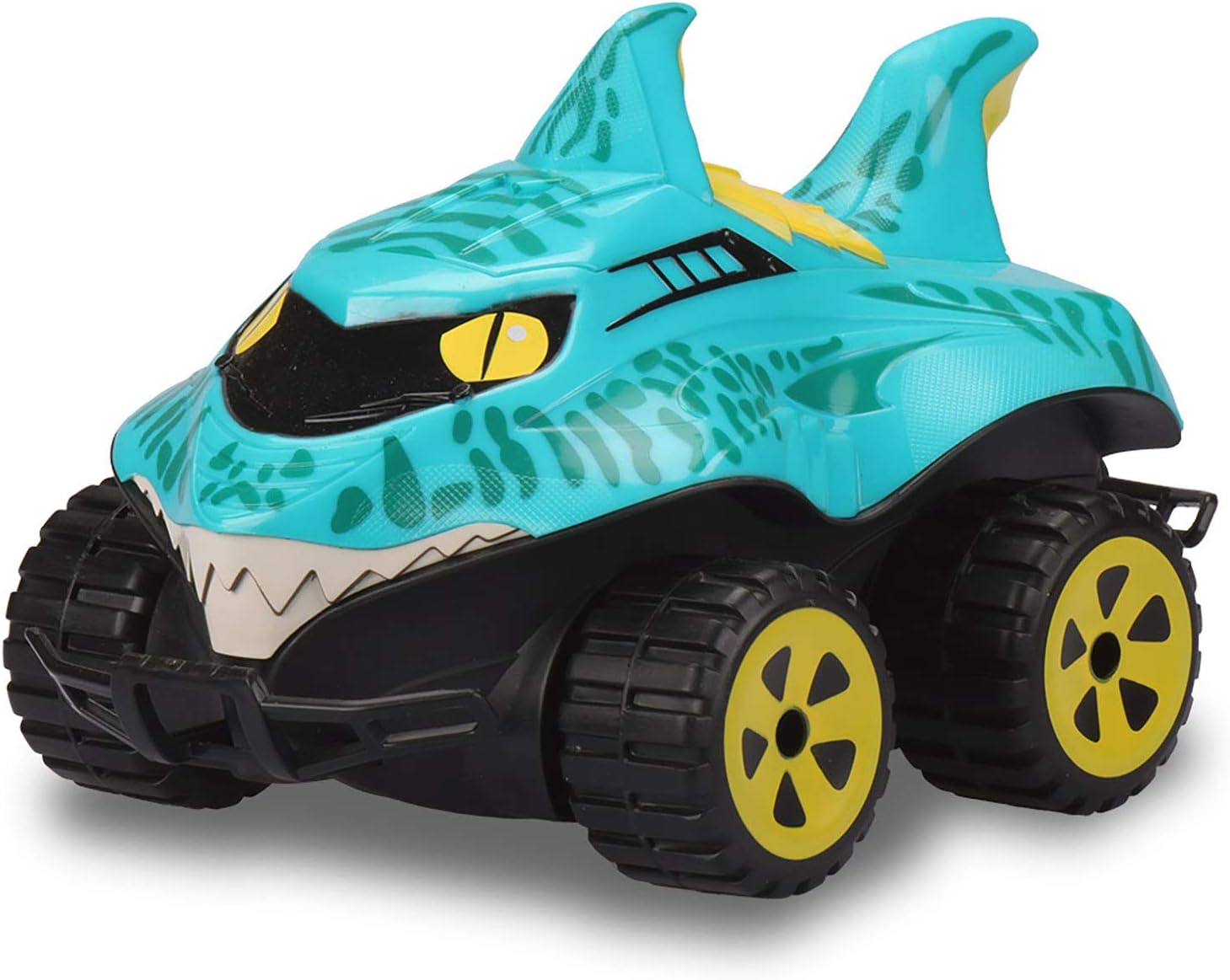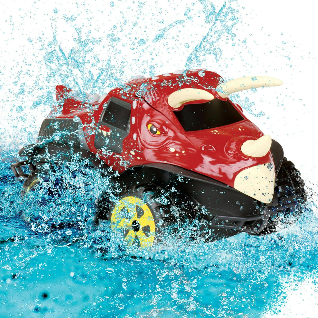 This powerful four wheel drive RC moves over the water, then even faster on land! This high-performance radio control amphibious creature can go anywhere- dirt, pond or pool. Features sturdy 4x4 turf digging tires for land and wake forming paddle wheel treads for ripping through the water. Powerful full-function controller makes explorations on any surface just a touch away.