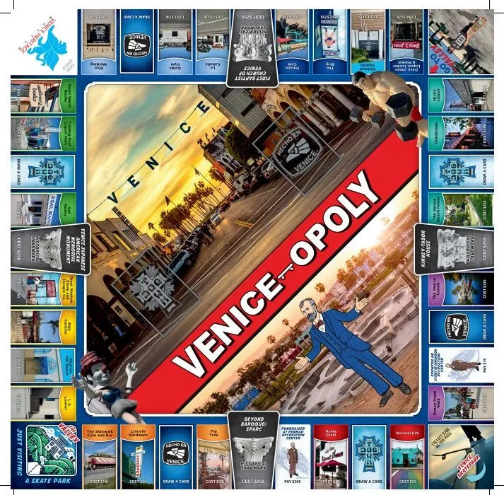 Take a colorful journey through the iconic streets, canals, and beach sand of Venice, California in Venice-Opoly! Inspired by one of the most vibrant and eclectic neighborhoods in America, this board game lets players experience the true spirit of Venice - from Muscle Beach and the historic Venice Sign to the buzzing Ocean Front Walk and Abbot Kinney Boulevard.