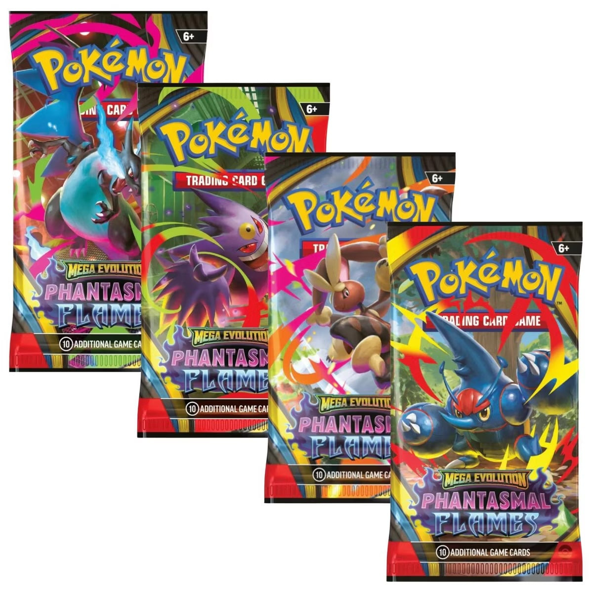 The latest booster pack is Mega Evolution. Each booster pack has a random assortment of six common cards, three uncommon cards, and one rare card. Each booster pack contains a parallel foil card among the assortment of 10 cards, and it might also contain a premium foil card. There is always at least one foil card in each booster pack!