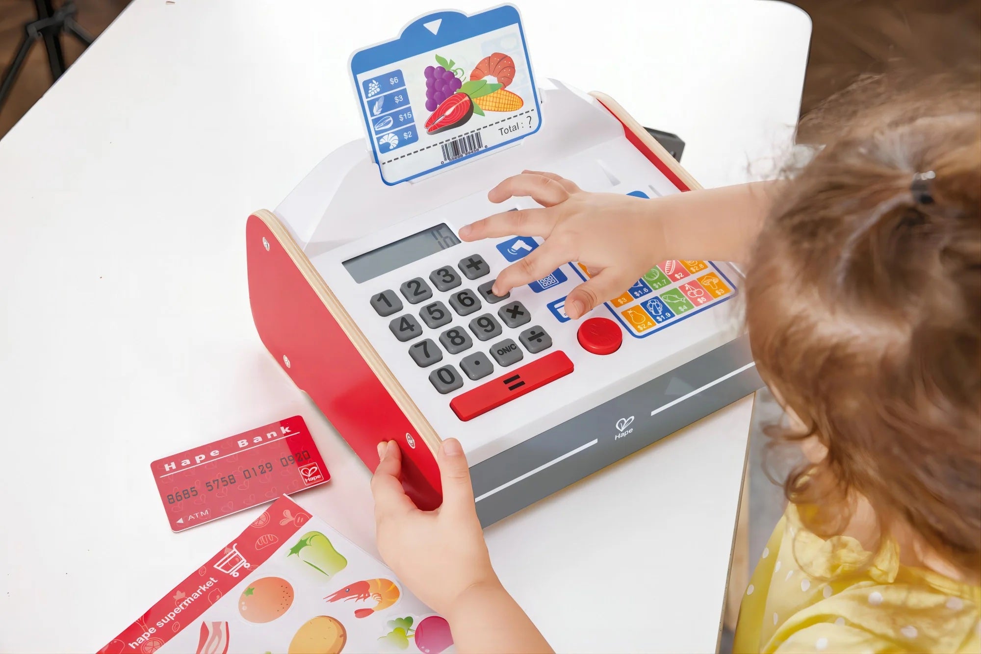 Learn how to manage money with this fantastic cash register! Select your groceries, then work out the price! With a solar-powered calculator, a scanner with light and sound effects, coins and notes to keep in the cash drawer.