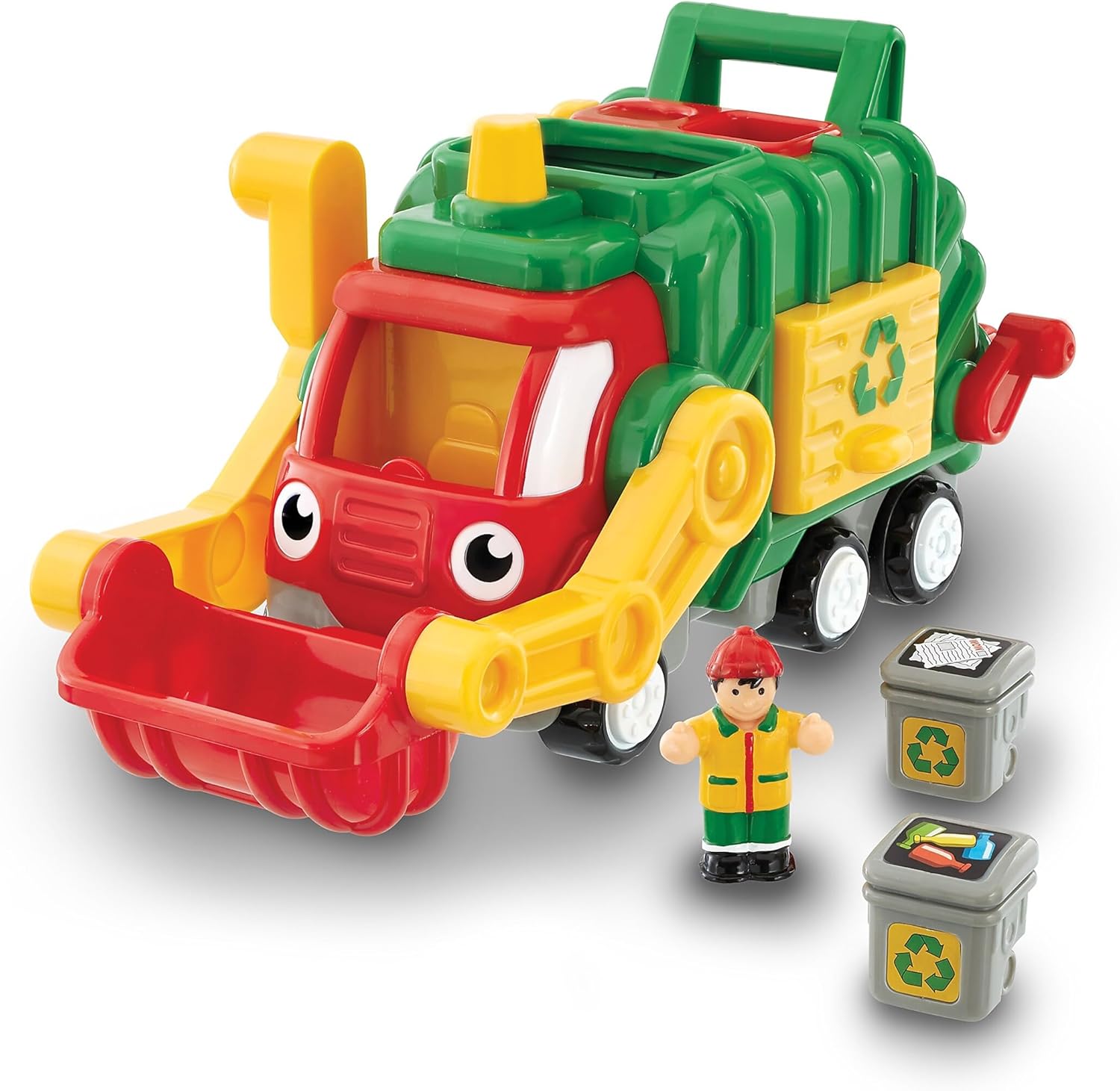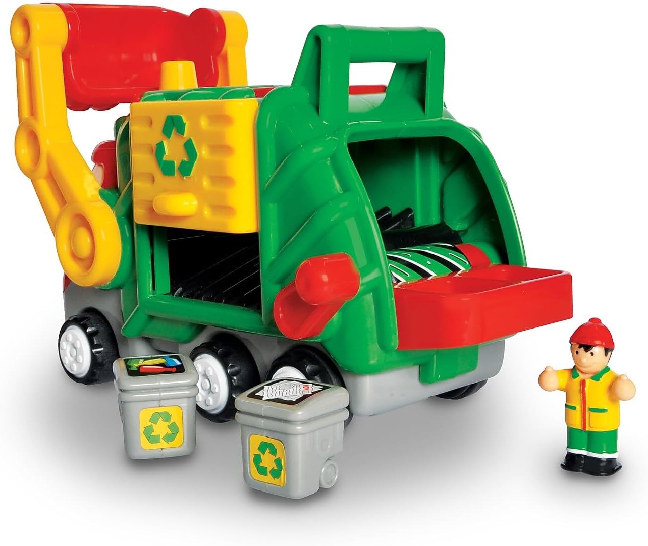 Eco kids everywhere will love to play with Fred! Sort his recycling bins into the buckets at the front and rear of his truck and pull his levers to send the recycling into the "crusher" to be sorted. Fred's Push & Go motorized engine makes realistic engine sounds while his waste crusher spins and his clicking side door opens to empty the bins.