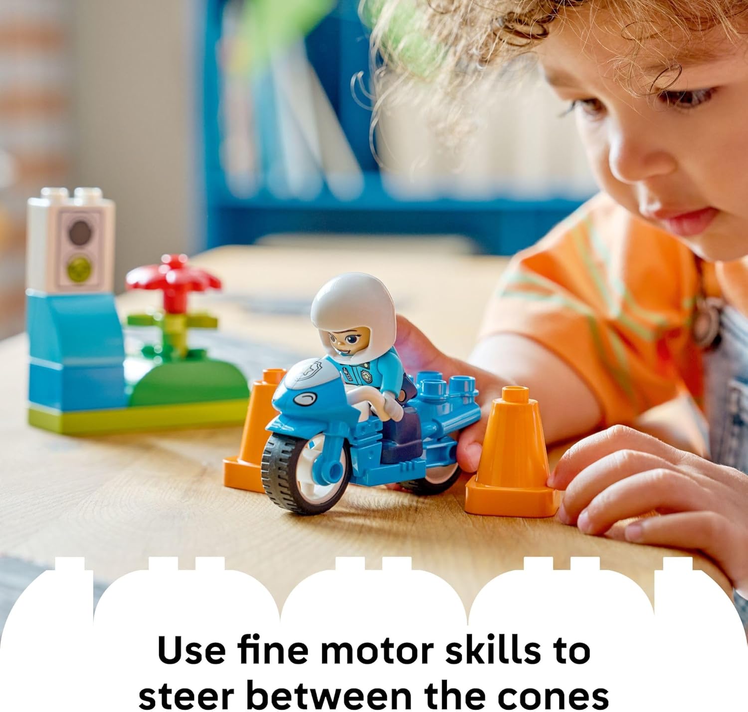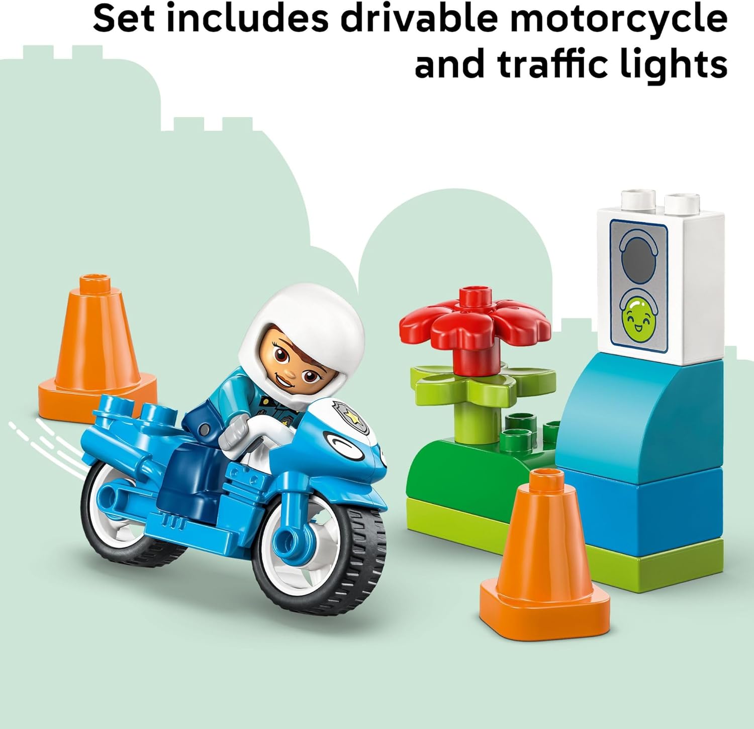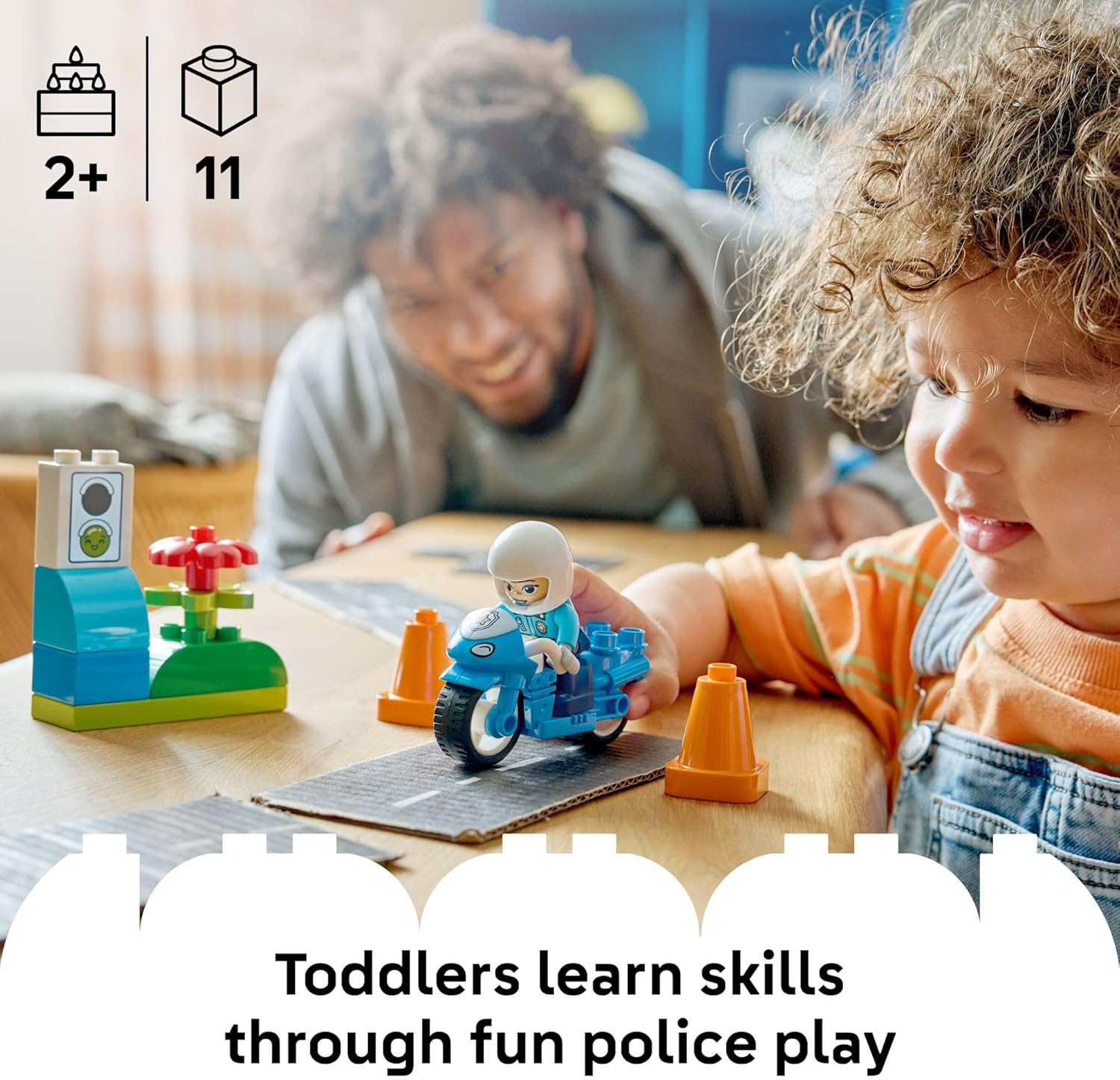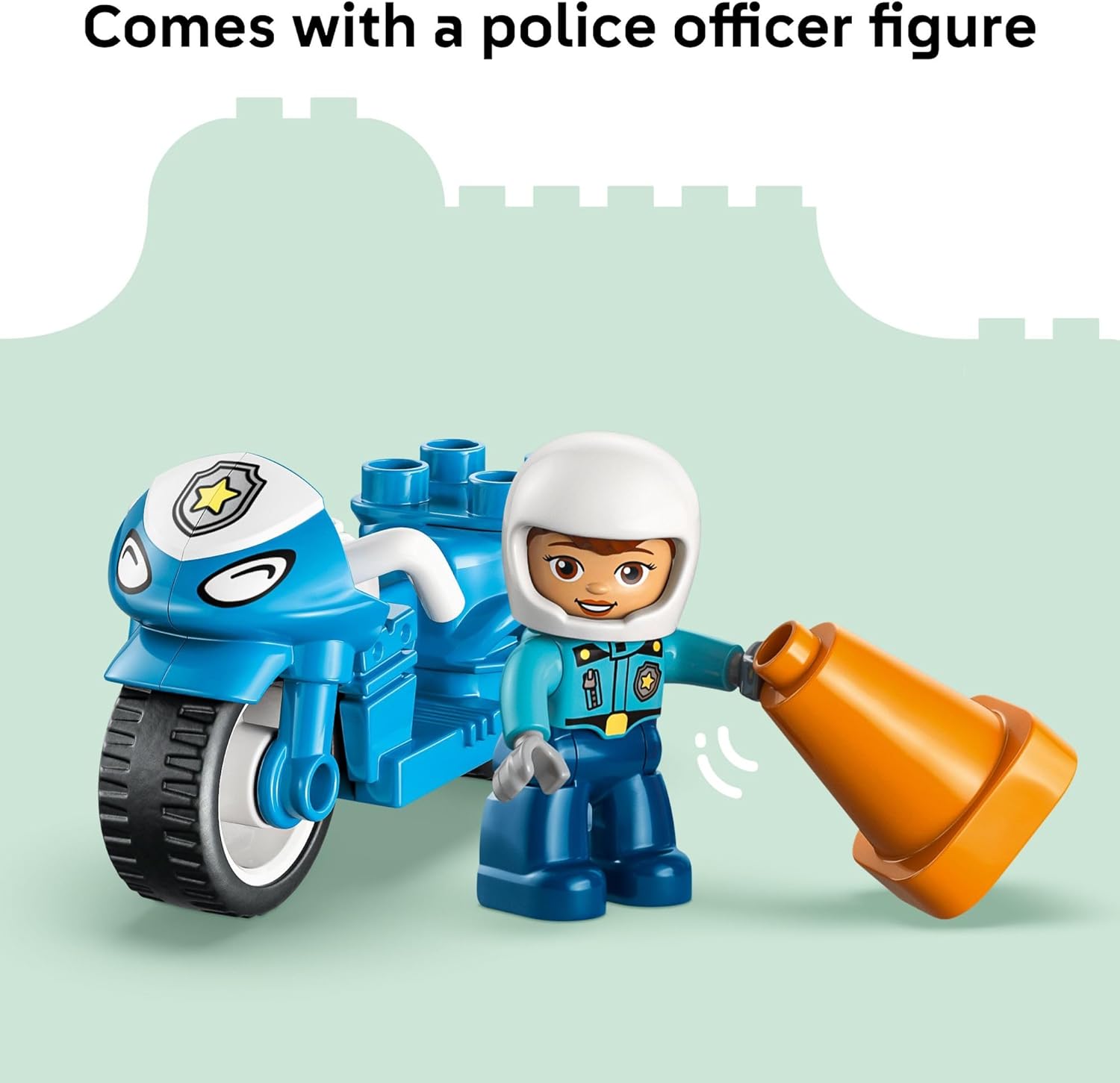 Introduce toddlers to community helpers with the LEGO DUPLO Town Blue Police Motorcycle (10471) building toy for boys and girls ages 2 years old and up. This preschool learning toy lets young children explore pretend play as they help the police officer patrol the neighborhood on her cool motorcycle. This small building set includes a police figure, toy motorcycle, traffic light decorated brick, and 2 cones. As kids place the police officer on the motorcycle and drive her around the cones, they develop fine motor skills and hand-eye coordination through hands-on play. The traffic light toy provides a fun way for parents to teach road safety—red means stop, green means go! With big, colorful building blocks designed for little hands, LEGO DUPLO sets help toddlers reach important developmental milestones through creative play. This educational toy encourages storytelling, problem-solving, and an understanding of community roles as children recreate real-life situations. Makes a thoughtful birthday gift or special occasion treat for preschool boys and girls who enjoy police toys, vehicle play, and imaginative adventures.