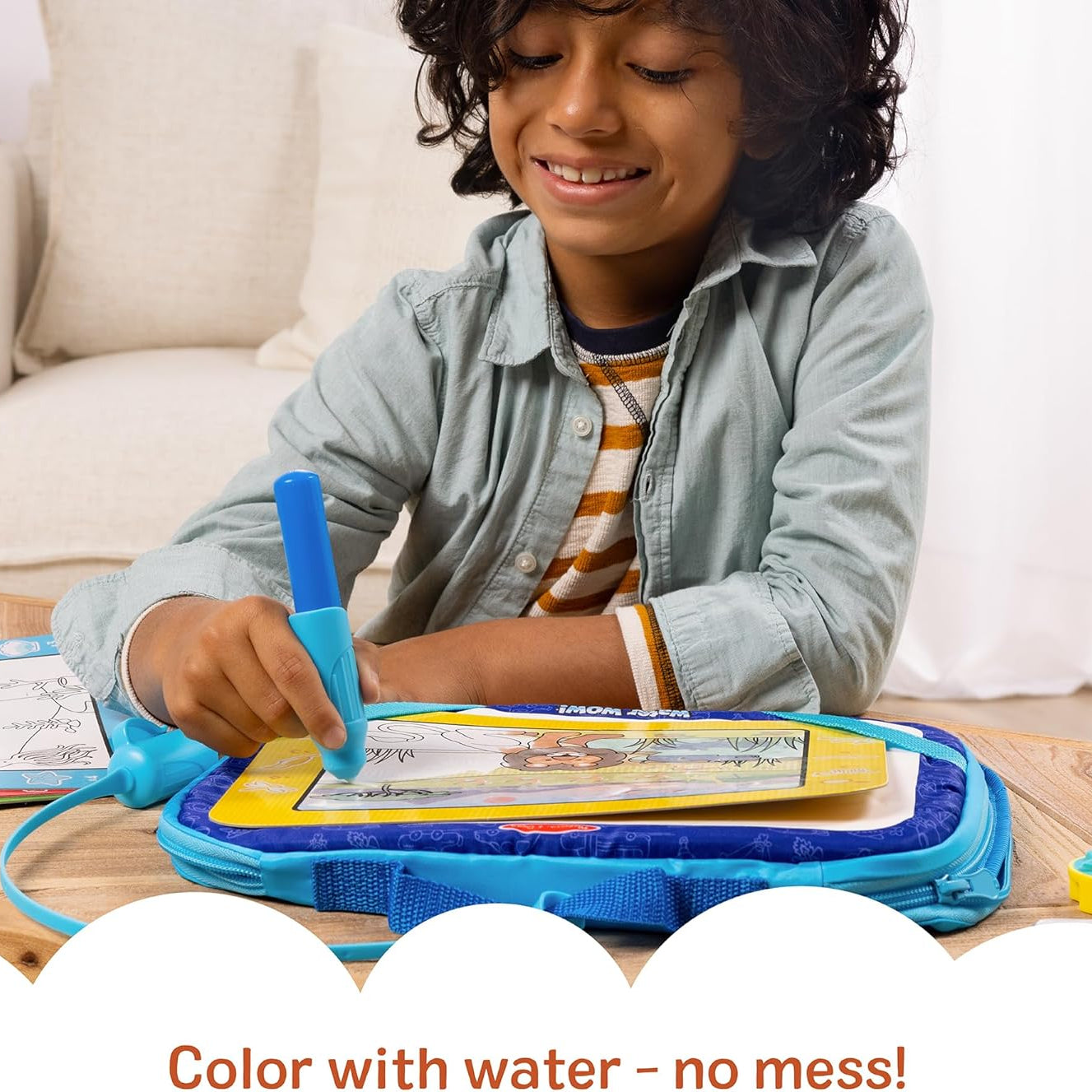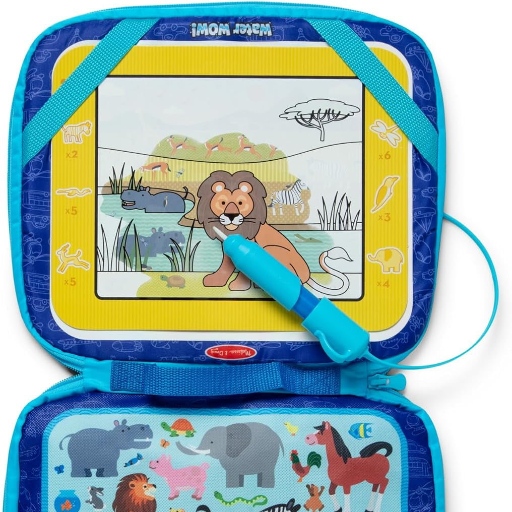 Discover new ways to color with water, then let dry and color again and again! The take-along zip-open case has a built-in drawing board with water-reveal rainbow swirls for free drawing, and pockets to hold reusable double-sided activity cards, two stencils for tracing, two stamps, a sponge stamp pad, and a large water pen that can tether to the case so it doesn’t go missing! The four activity cards each include a water-reveal scene (farm, safari, pets, ocean), search-and-find activities, and how-to-draw illustrations. Everything stores in the case, making the Melissa & Doug Water WOW! Multi-Activity Drawing Set the perfect mess-free, reusable travel activity for families on the go!